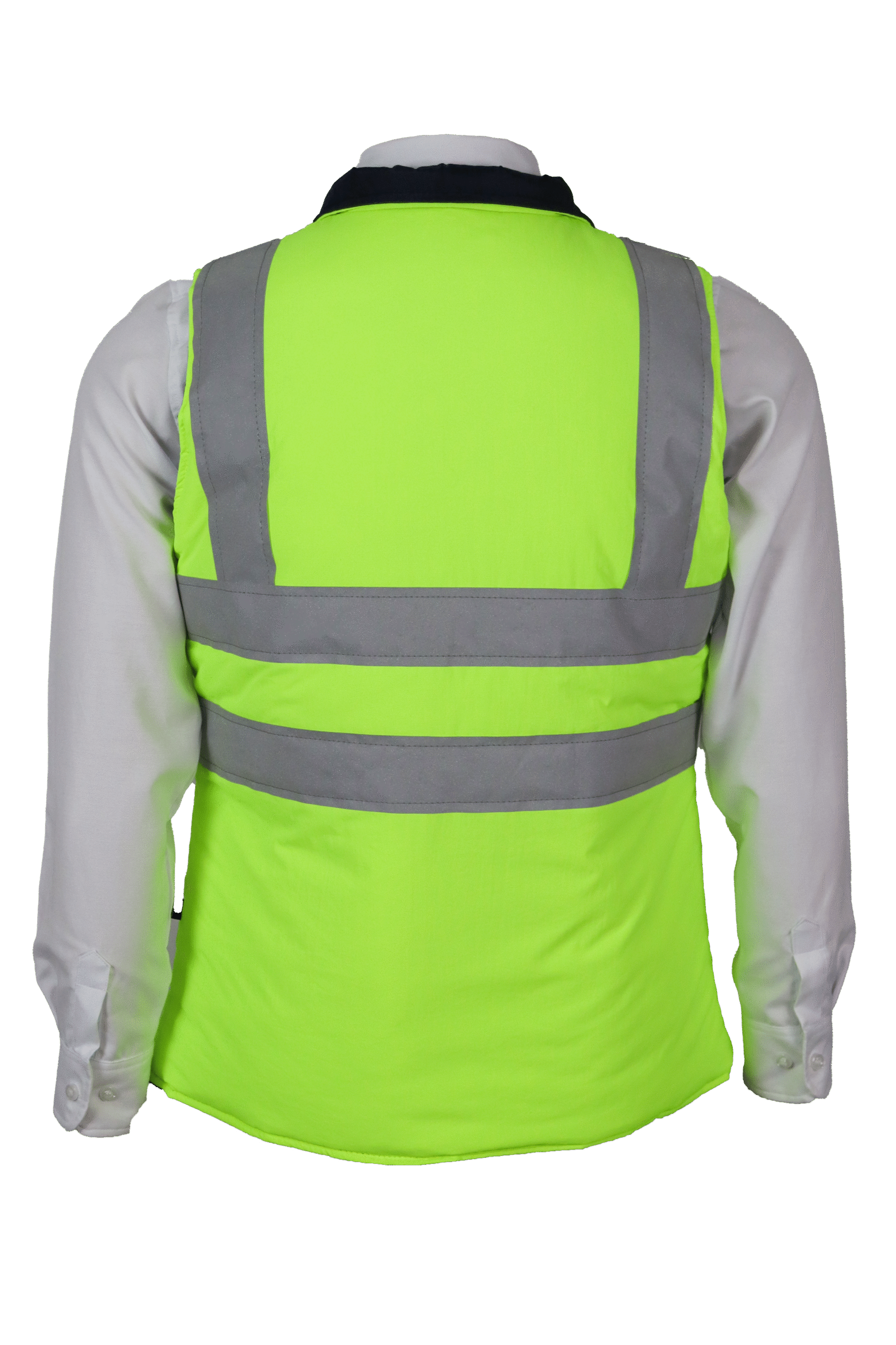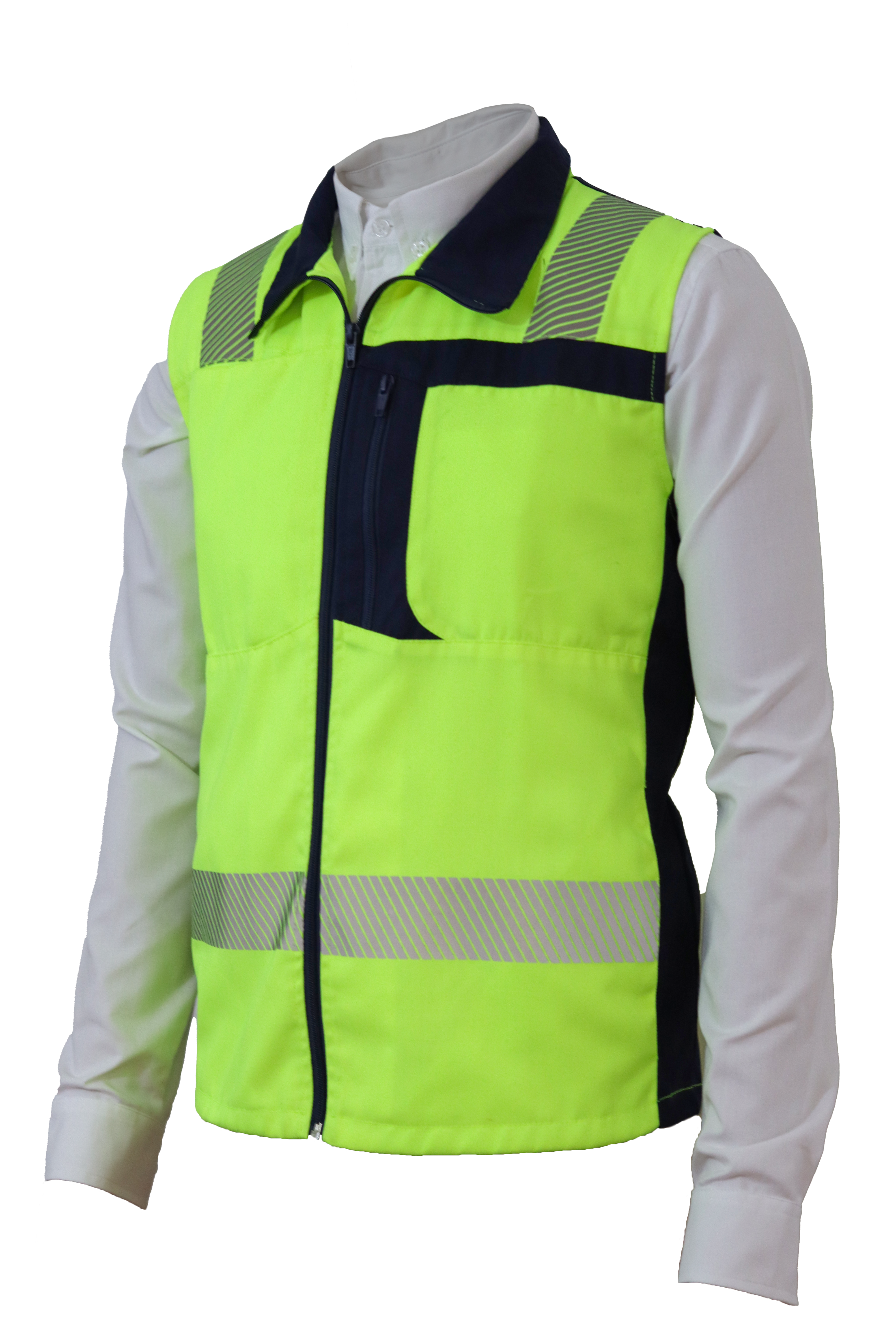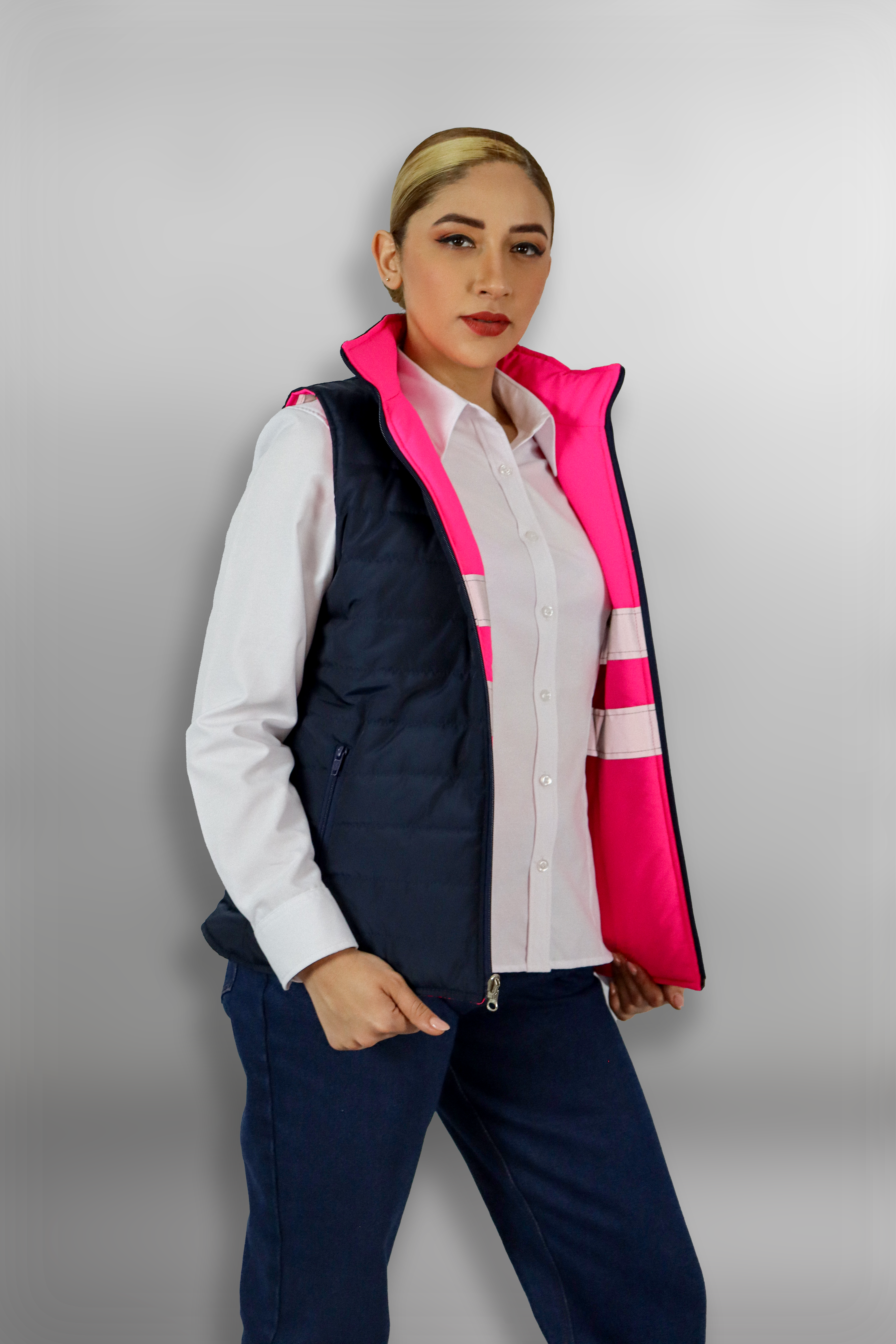 Chaleco ejecutivo de corte dama y caballero, confeccionado en 100% poliéster, lo que garantiza durabilidad, resistencia y comodidad. Su diseño combina un exterior en tono oscuro con un forro interior en colores vibrantes, aportando un contraste moderno y elegante. Incorpora tiras reflejantes para alta visibilidad, lo que incrementa la seguridad en diferentes entornos. Cuenta con cierre frontal y bolsillos laterales funcionales, ideal para entornos corporativos que buscan proyectar una imagen profesional sin perder estilo.