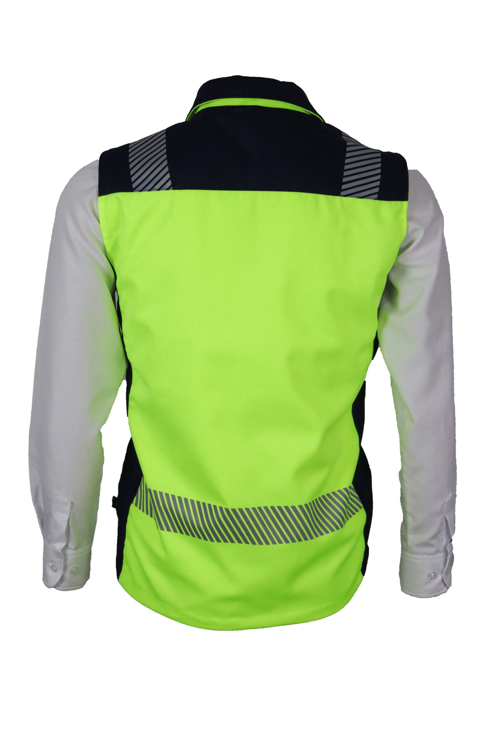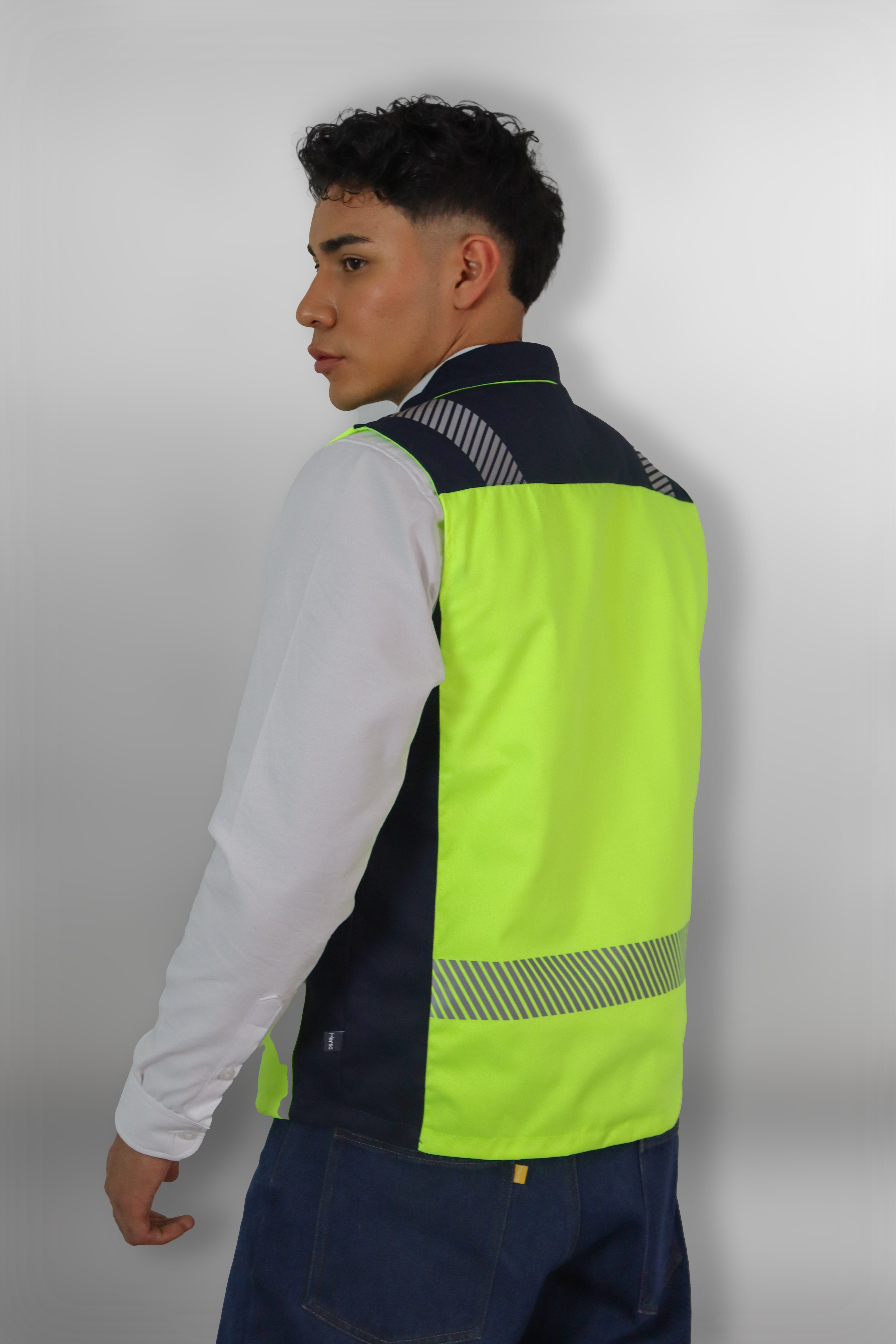 Chaleco de protección civil, confeccionado en material resistente de alta visibilidad en color fluorescente. Incorpora reflejante segmentado estampado, que mejora la seguridad al brindar mayor visibilidad en condiciones de baja iluminación. Cuenta con cierre frontal y bolsillos funcionales, ideal para actividades operativas y de respuesta en emergencias.