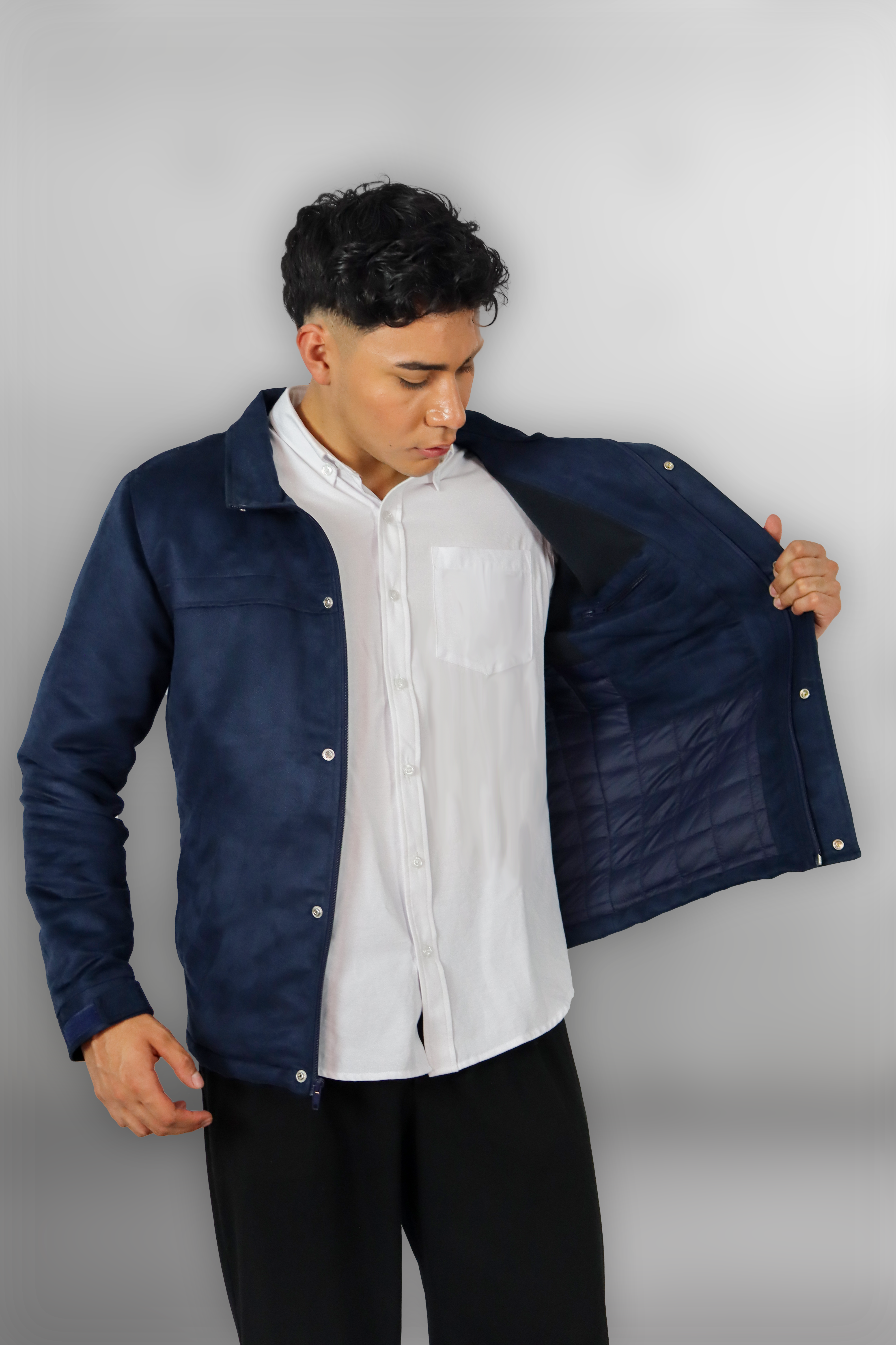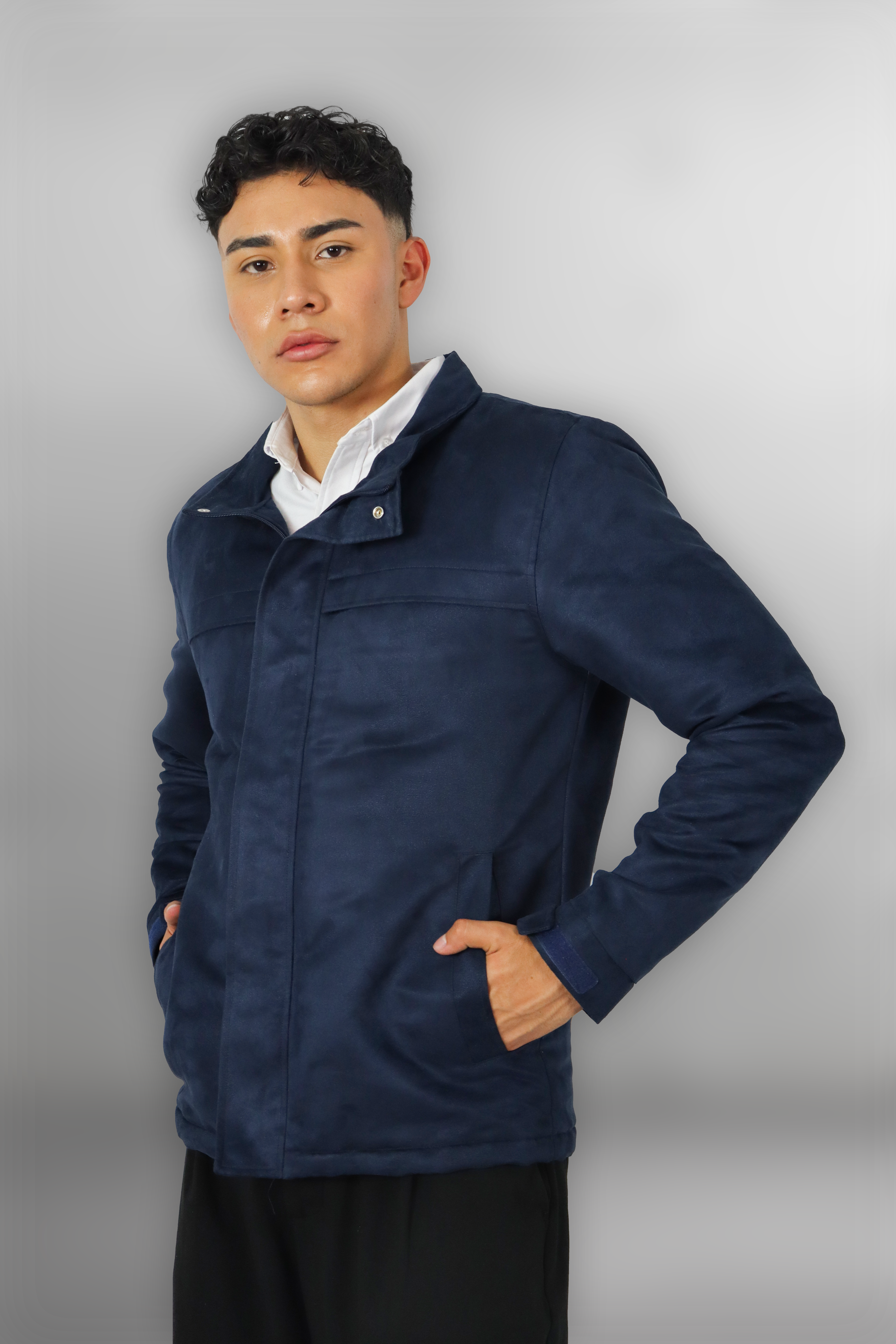 Cuello alto con estructura firme, pensado para proteger del viento y conservar una apariencia pulida, detalles solapa con broche oculto, que proporciona un acabado minimalista y elegante.