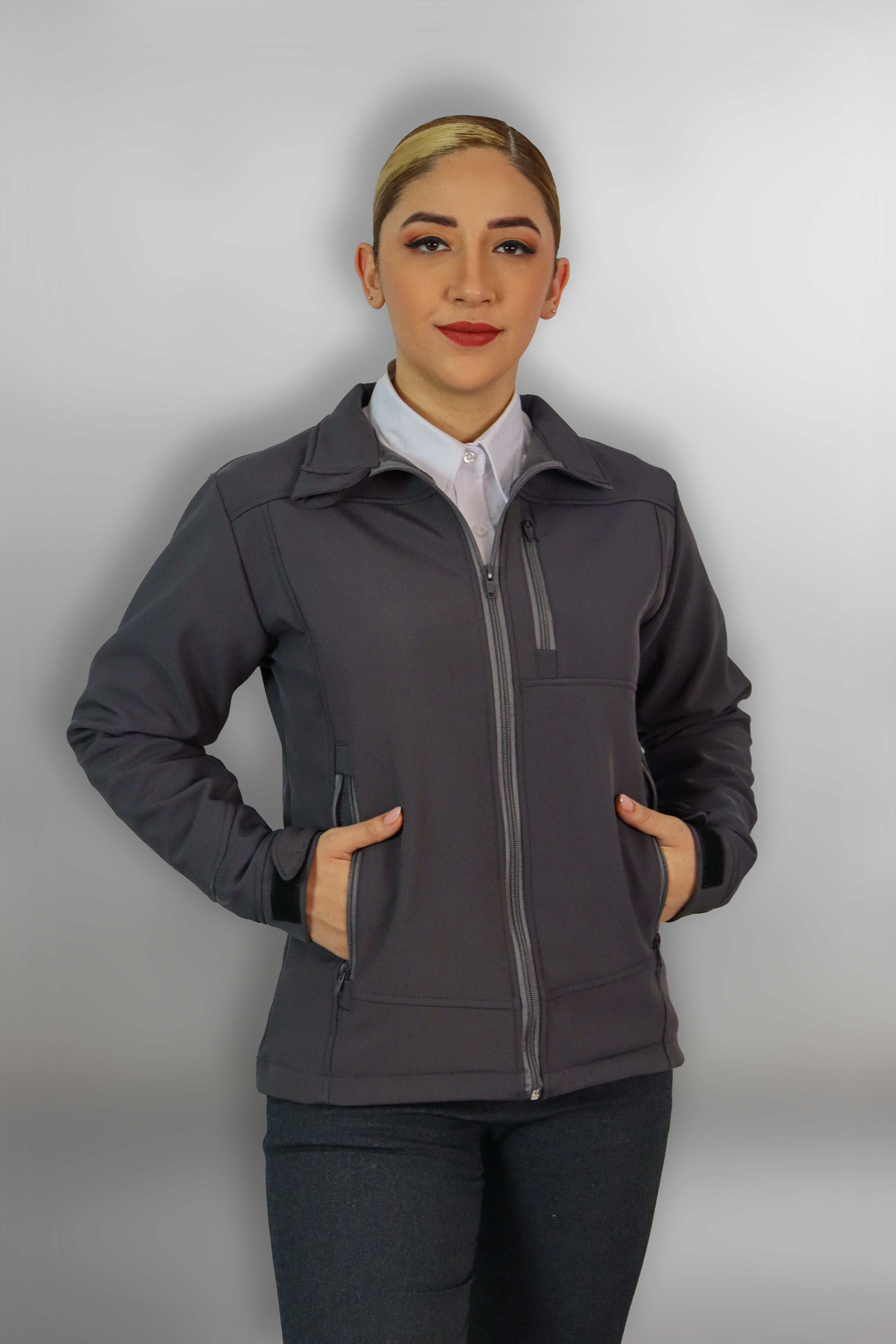 Esta chamarra ejecutiva está fabricada con un 97% poliéster y un 3% spandex, ofreciendo durabilidad y elasticidad. Su diseño cortado tanto para dama como para caballero proporciona comodidad y un ajuste perfecto.